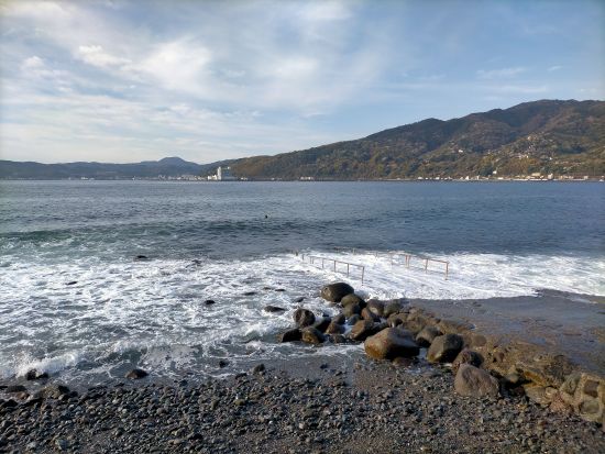 (ビーチ)→現在、宇佐美ビーチには、5匹のアオウミガメがいます。よくいる場所が決まっているカメも数匹います。一番大きなカメは、10mのテトラポッド下のくぼみにいることが多いです。2番目に大きなカメは土管方面に向かうガイドロープに出てくる大きなアンカー(水深9mくらい)の横にいることが多いです。それ以外の3匹は、線路付近で遭遇したり、土管エリアで遭遇したりまちまちです。また、ネコザメは土管エリアでは確実に出会えます。土管エリア以外での偶然の遭遇も、冬季は多いです。